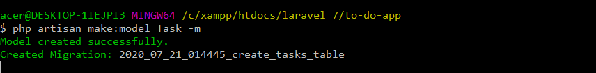 For our application, it will require to work on the Users and Task module for the Todo app API. So, the todo app will require two models and migrations. The models and migrations will be for the User and for the Task. In Laravel, it provides a default model and migration for the user. Hence, we will require only one to create. That is for the task. So, let’s create a model and migration for the task.