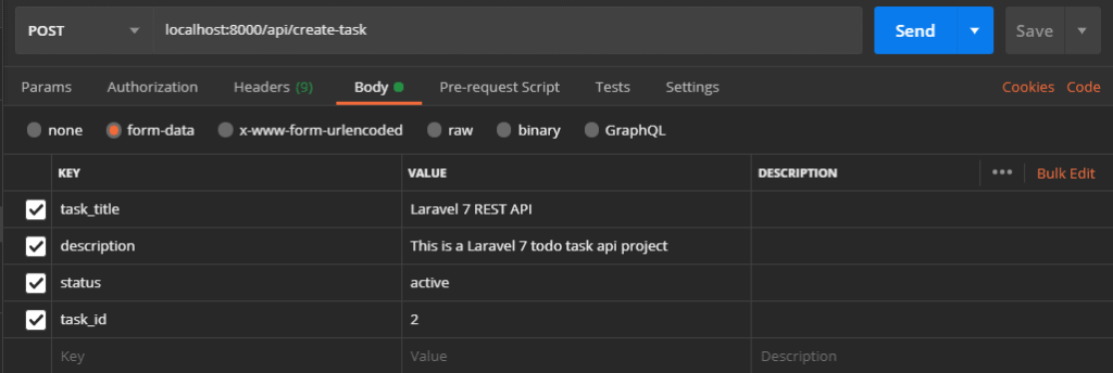 For updating the task, you will have to pass one more field through which the task will be updating. So, the primary field is id. Hence, we will have to pass the id of the task in the form fields.