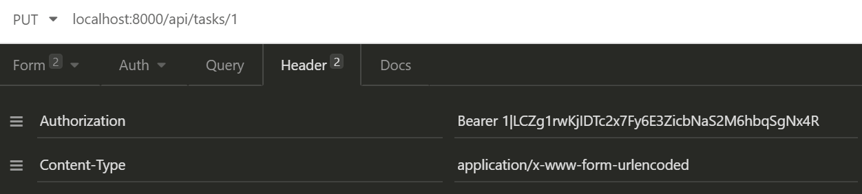 Here, I have used the PUT method to update the task. For the input, you can pass the key value in the param. In that case, you will not require to pass the Content-Type.